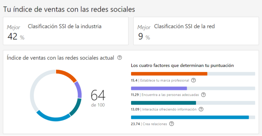 El SSI o Social Selling Index es una valoración de 1 a 100 que LinkedIn otorga midiendo 4 aspectos fundamentales: Tu marca personal, si encuentras los contactos adecuados, si interactúas y aportas información y si construyes relaciones. Cada área aporta 25 puntos, con lo que en suma la nota máxima es de 100 puntos.